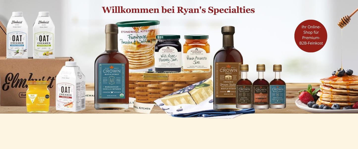 Ryan’s Specialties ist Ihr zuverlässiger Partner für Feinkost Großhandel in Deutschland und Europa. Unser Sortiment umfasst Neuheiten und Bestseller aus den Bereichen Saucen & Ketchups, Aiolis, Relishes, Gewürze & Rubs, Aufstriche, Snacks, Süßes & Popcorn, Pfannkuchen & Sirup, Backzutaten & Backmischungen, Getränke & Tee sowie Cocktails und Dressings. Im Bereich Lifestyle & Dekoration bieten wir außerdem Kerzen, Seifen, Küchenutensilien, Grill & BBQ-Zubehör und Textilien.